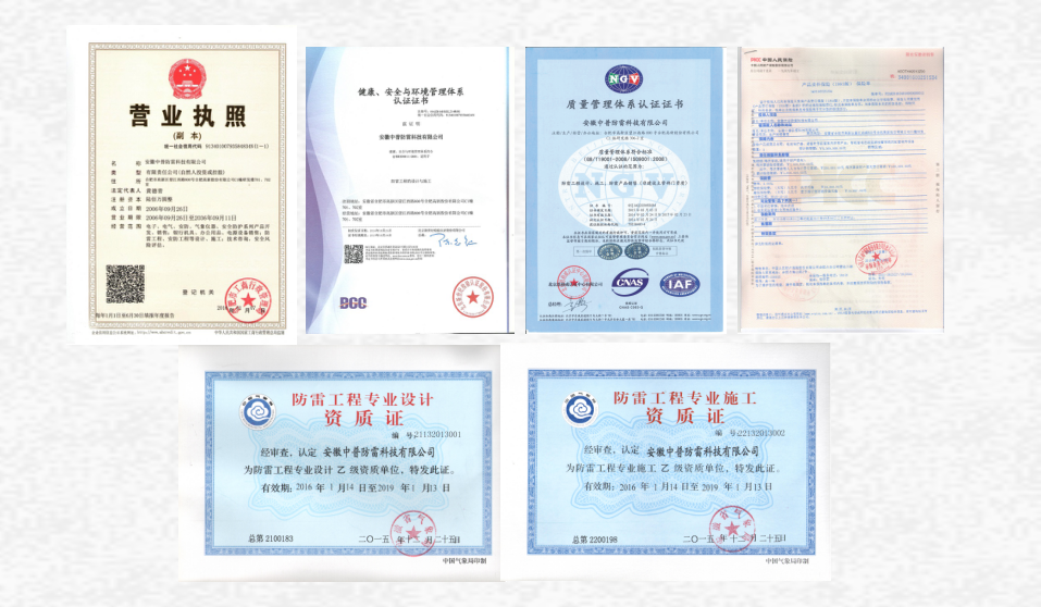 公司使用的產(chǎn)品均通過了北京雷電防護裝置測試中心等國家權威性檢測機構檢測,具有CE、CCC等相關認證,以過硬的工程質量獲得了中國人保的工程質量承保。